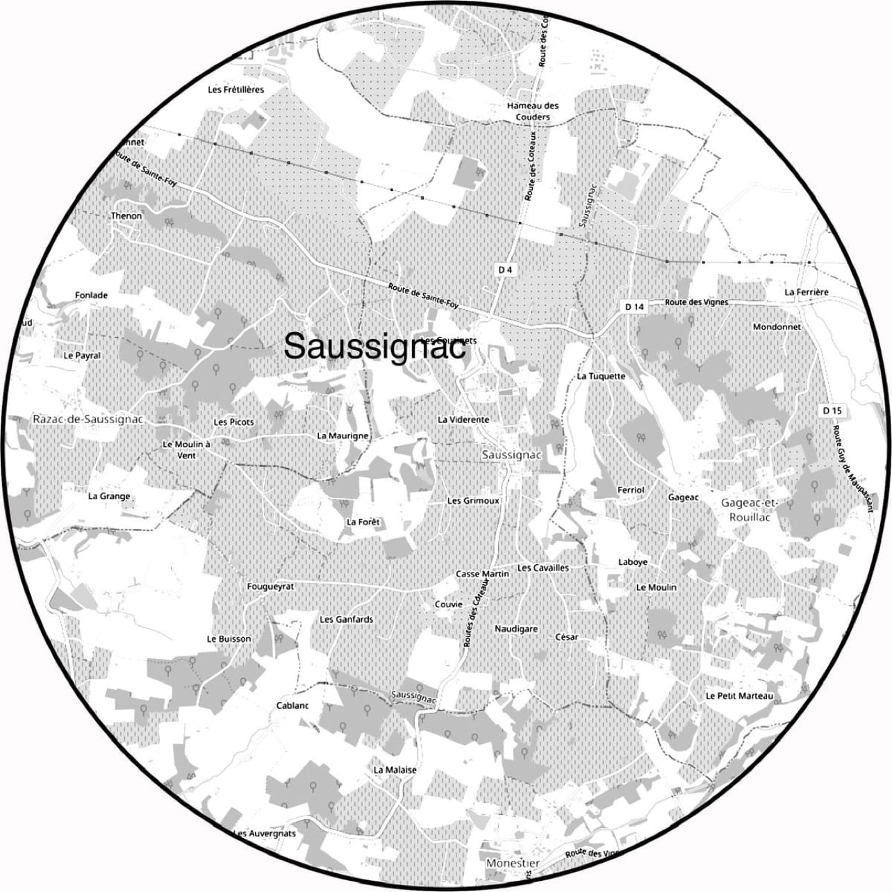 Saussignac liegt westlich von Monbazillac und grenzt an das Bordeaux-Gebietes. Saussignac kommt nur aus den Orten Gageac-Rouillac, Monestier, Razac de Saussignac und Saussignac. Ca 900 Hektar auf Böden die von Ton- und Kalkschichten durchsetzt und eisenhaltig sind, wodurch der Saussignac seinen individuellen Charakter bekommt.